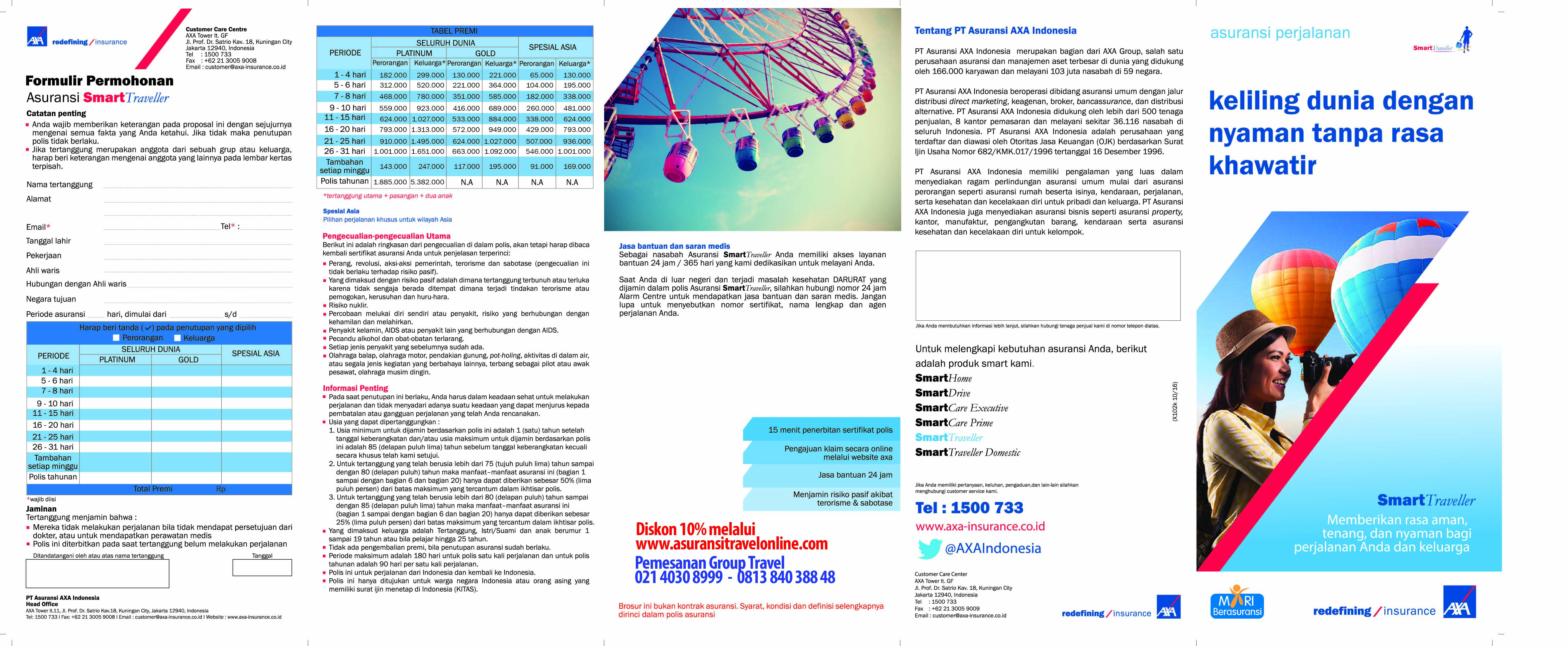 Dapatkan kemudahan untuk membeli dan memperoleh polis Asuransi Travel atau Asuransi Perjalanan secara Online dengan Cepat dan Mudah, serta Diskon 10% untuk pembelian Asuransi Perjalanan AXA SmartTraveller Online dari PT Asuransi AXA Indonesia. Produk asuransi perjalanan AXA SmartTraveller dari PT Asuransi AXA Indonesia memberikan Anda ketenangan selama melakukan perjalanan liburan maupun bisnis, baik untuk wilayah di negara-negara ASIA, Schengen, maupun seluruh dunia (worldwide).
